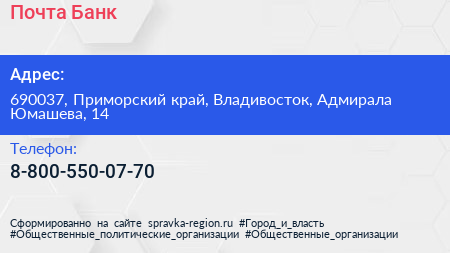 Почта Банк по адресу 690037, Приморский край, Владивосток, Адмирала Юмашева, 14 в дальнейшем Организация, размещена в следующих категориях: