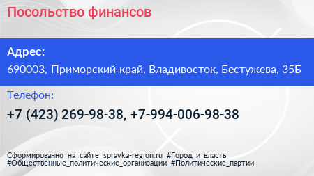 Посольство финансов по адресу 690003, Приморский край, Владивосток, Бестужева, 35Б в дальнейшем Организация, размещена в следующих категориях:
