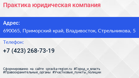 Практика, юридическая компания по адресу 690065, Приморский край, Владивосток, Стрельникова, 5 в дальнейшем Организация, размещена в следующих категориях: