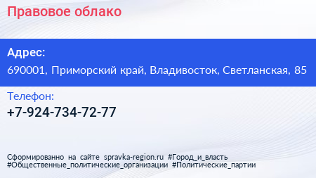 Правовое облако по адресу 690001, Приморский край, Владивосток, Светланская, 85 в дальнейшем Организация, размещена в следующих категориях: