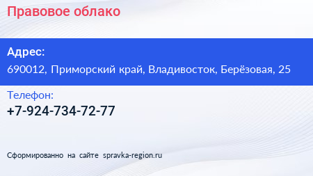 Правовое облако по адресу 690012, Приморский край, Владивосток, Берёзовая, 25 в дальнейшем Организация, размещена в следующих категориях: