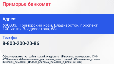 Приморье, банкомат по адресу 690033, Приморский край, Владивосток, проспект 100-летия Владивостока, 68а в дальнейшем Организация, размещена в следующих категориях: