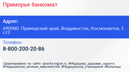 Приморье, банкомат по адресу 690080, Приморский край, Владивосток, Космонавтов, 1 ст2 в дальнейшем Организация, размещена в следующих категориях: