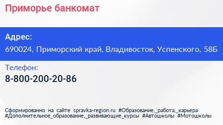 Приморье, банкомат по адресу 690024, Приморский край, Владивосток, Успенского, 58Б в дальнейшем Организация, размещена в следующих категориях: