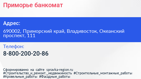 Приморье, банкомат по адресу 690002, Приморский край, Владивосток, Океанский проспект, 111 в дальнейшем Организация, размещена в следующих категориях: