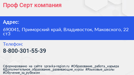 Проф-Серт, компания по адресу 690041, Приморский край, Владивосток, Маковского, 22 ст3 в дальнейшем Организация, размещена в следующих категориях: