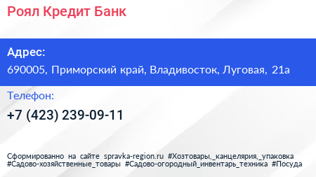 Роял Кредит Банк по адресу 690005, Приморский край, Владивосток, Луговая, 21а в дальнейшем Организация, размещена в следующих категориях:
