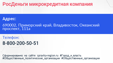 РосДеньги, микрокредитная компания по адресу 690002, Приморский край, Владивосток, Океанский проспект, 111а в дальнейшем Организация, размещена в следующих категориях: