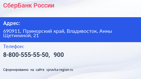 СберБанк России по адресу 690911, Приморский край, Владивосток, Анны Щетининой, 21 в дальнейшем Организация, размещена в следующих категориях: