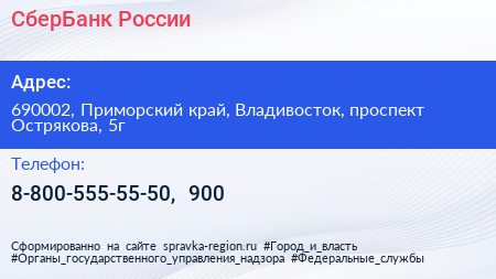 СберБанк России по адресу 690002, Приморский край, Владивосток, проспект Острякова, 5г в дальнейшем Организация, размещена в следующих категориях: