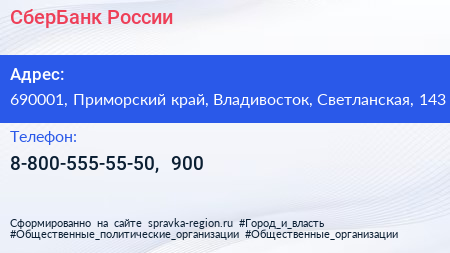 СберБанк России по адресу 690001, Приморский край, Владивосток, Светланская, 143 в дальнейшем Организация, размещена в следующих категориях: