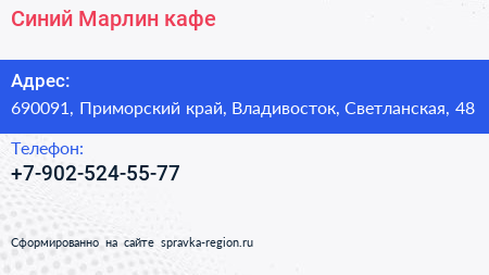 Синий Марлин, кафе по адресу 690091, Приморский край, Владивосток, Светланская, 48 в дальнейшем Организация, размещена в следующих категориях:
