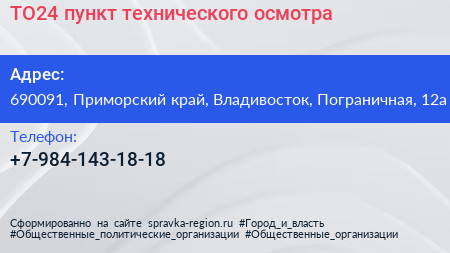 ТО24, пункт технического осмотра по адресу 690091, Приморский край, Владивосток, Пограничная, 12а в дальнейшем Организация, размещена в следующих категориях: