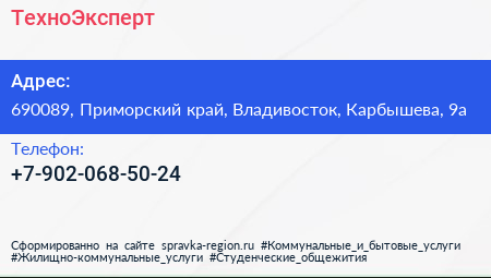ТехноЭксперт по адресу 690089, Приморский край, Владивосток, Карбышева, 9а в дальнейшем Организация, размещена в следующих категориях: