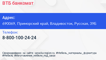 ВТБ, банкомат по адресу 690069, Приморский край, Владивосток, Русская, 39Б в дальнейшем Организация, размещена в следующих категориях: