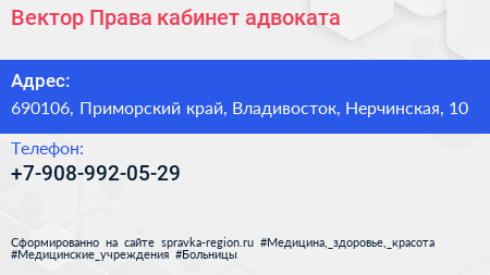 Вектор Права, кабинет адвоката по адресу 690106, Приморский край, Владивосток, Нерчинская, 10 в дальнейшем Организация, размещена в следующих категориях: