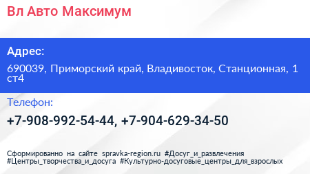 Вл Авто Максимум по адресу 690039, Приморский край, Владивосток, Станционная, 1 ст4 в дальнейшем Организация, размещена в следующих категориях: