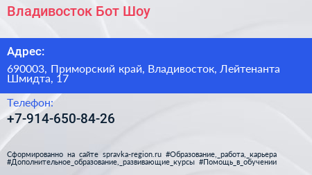 Владивосток Бот Шоу по адресу 690003, Приморский край, Владивосток, Лейтенанта Шмидта, 17 в дальнейшем Организация, размещена в следующих категориях:
