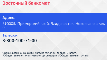 Восточный, банкомат по адресу 690005, Приморский край, Владивосток, Новоивановская, 3 в дальнейшем Организация, размещена в следующих категориях: