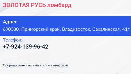 ЗОЛОТАЯ РУСЬ, ломбард по адресу 690080, Приморский край, Владивосток, Сахалинская, 41г в дальнейшем Организация, размещена в следующих категориях: