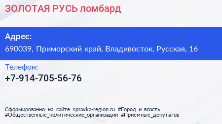 ЗОЛОТАЯ РУСЬ, ломбард по адресу 690039, Приморский край, Владивосток, Русская, 16 в дальнейшем Организация, размещена в следующих категориях: