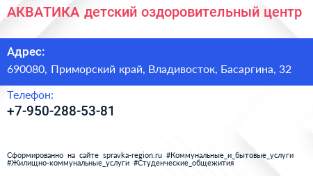 АКВАТИКА, детский оздоровительный центр по адресу 690080, Приморский край, Владивосток, Басаргина, 32 в дальнейшем Организация, размещена в следующих категориях: