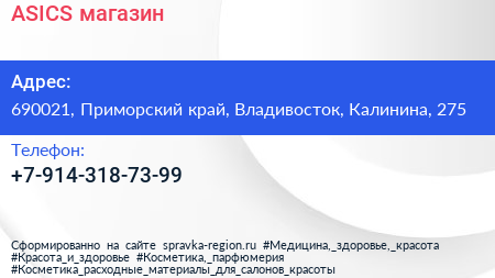 ASICS, магазин по адресу 690021, Приморский край, Владивосток, Калинина, 275 в дальнейшем Организация, размещена в следующих категориях: