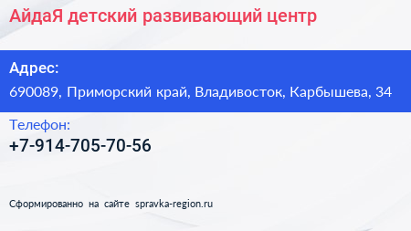 АйдаЯ, детский развивающий центр по адресу 690089, Приморский край, Владивосток, Карбышева, 34 в дальнейшем Организация, размещена в следующих категориях: