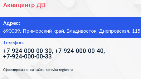 Аквацентр ДВ по адресу 690089, Приморский край, Владивосток, Днепровская, 115 в дальнейшем Организация, размещена в следующих категориях: