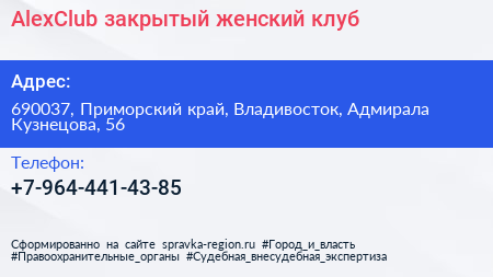 AlexClub, закрытый женский клуб по адресу 690037, Приморский край, Владивосток, Адмирала Кузнецова, 56 в дальнейшем Организация, размещена в следующих категориях: