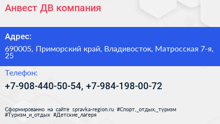 Анвест ДВ, компания по адресу 690005, Приморский край, Владивосток, Матросская 7-я, 25 в дальнейшем Организация, размещена в следующих категориях: