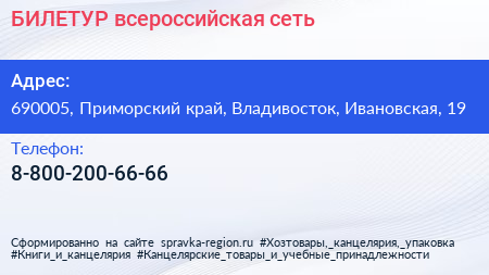 БИЛЕТУР, всероссийская сеть по адресу 690005, Приморский край, Владивосток, Ивановская, 19 в дальнейшем Организация, размещена в следующих категориях:
