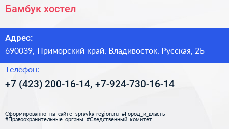 Бамбук, хостел по адресу 690039, Приморский край, Владивосток, Русская, 2Б в дальнейшем Организация, размещена в следующих категориях: