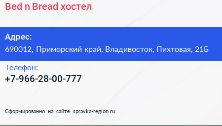 Bed`n`Bread, хостел по адресу 690012, Приморский край, Владивосток, Пихтовая, 21Б в дальнейшем Организация, размещена в следующих категориях:
