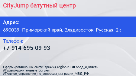 CityJump, батутный центр по адресу 690039, Приморский край, Владивосток, Русская, 2к в дальнейшем Организация, размещена в следующих категориях: