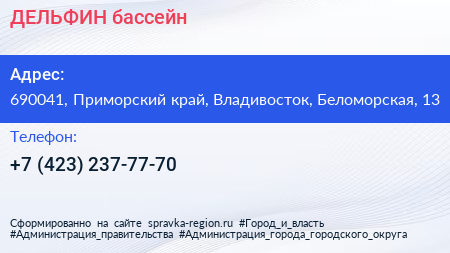 ДЕЛЬФИН, бассейн по адресу 690041, Приморский край, Владивосток, Беломорская, 13 в дальнейшем Организация, размещена в следующих категориях: