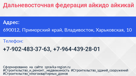 Дальневосточная федерация айкидо айкикай по адресу 690012, Приморский край, Владивосток, Харьковская, 10 в дальнейшем Организация, размещена в следующих категориях:
