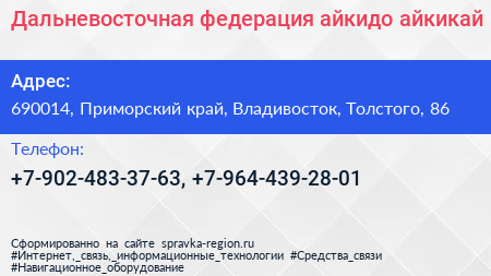Дальневосточная федерация айкидо айкикай по адресу 690014, Приморский край, Владивосток, Толстого, 86 в дальнейшем Организация, размещена в следующих категориях: