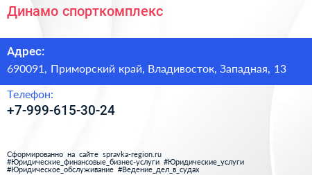 Динамо, спорткомплекс по адресу 690091, Приморский край, Владивосток, Западная, 13 в дальнейшем Организация, размещена в следующих категориях: