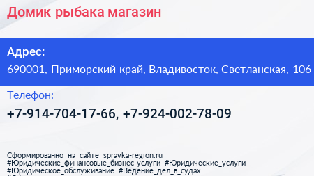 Домик рыбака, магазин по адресу 690001, Приморский край, Владивосток, Светланская, 106 в дальнейшем Организация, размещена в следующих категориях: