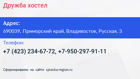 Дружба, хостел по адресу 690039, Приморский край, Владивосток, Русская, 3 в дальнейшем Организация, размещена в следующих категориях: