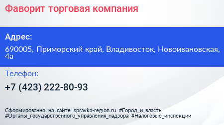 Фаворит, торговая компания по адресу 690005, Приморский край, Владивосток, Новоивановская, 4а в дальнейшем Организация, размещена в следующих категориях: