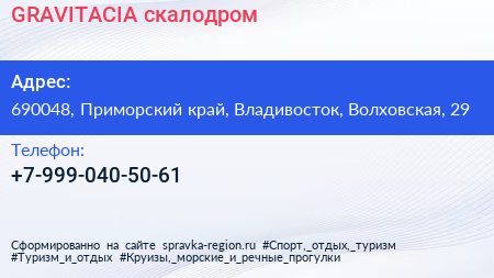 GRAVITACIA, скалодром по адресу 690048, Приморский край, Владивосток, Волховская, 29 в дальнейшем Организация, размещена в следующих категориях:
