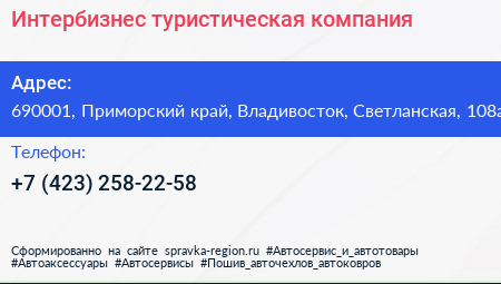 Интербизнес, туристическая компания по адресу 690001, Приморский край, Владивосток, Светланская, 108а в дальнейшем Организация, размещена в следующих категориях: