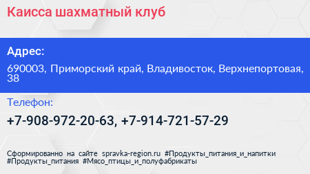 Каисса, шахматный клуб по адресу 690003, Приморский край, Владивосток, Верхнепортовая, 38 в дальнейшем Организация, размещена в следующих категориях: