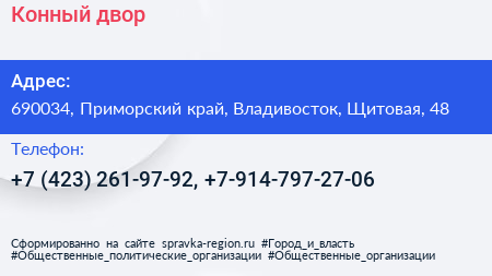 Конный двор по адресу 690034, Приморский край, Владивосток, Щитовая, 48 в дальнейшем Организация, размещена в следующих категориях:
