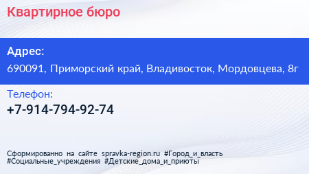 Квартирное бюро по адресу 690091, Приморский край, Владивосток, Мордовцева, 8г в дальнейшем Организация, размещена в следующих категориях:
