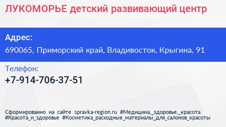 ЛУКОМОРЬЕ, детский развивающий центр по адресу 690065, Приморский край, Владивосток, Крыгина, 91 в дальнейшем Организация, размещена в следующих категориях: