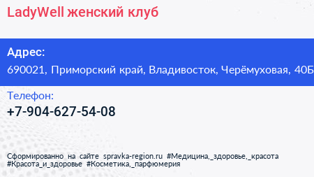 LadyWell, женский клуб по адресу 690021, Приморский край, Владивосток, Черёмуховая, 40Б в дальнейшем Организация, размещена в следующих категориях: