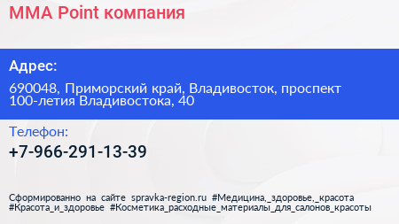 MMA Point, компания по адресу 690048, Приморский край, Владивосток, проспект 100-летия Владивостока, 40 в дальнейшем Организация, размещена в следующих категориях: